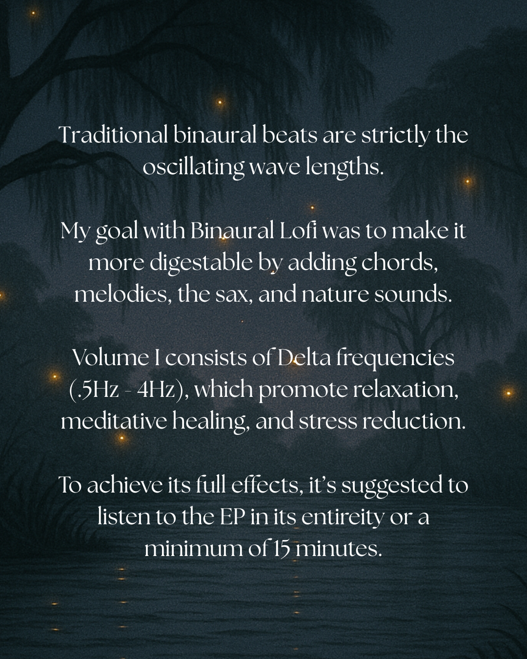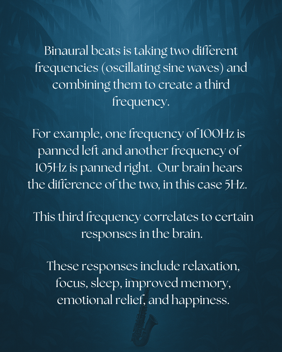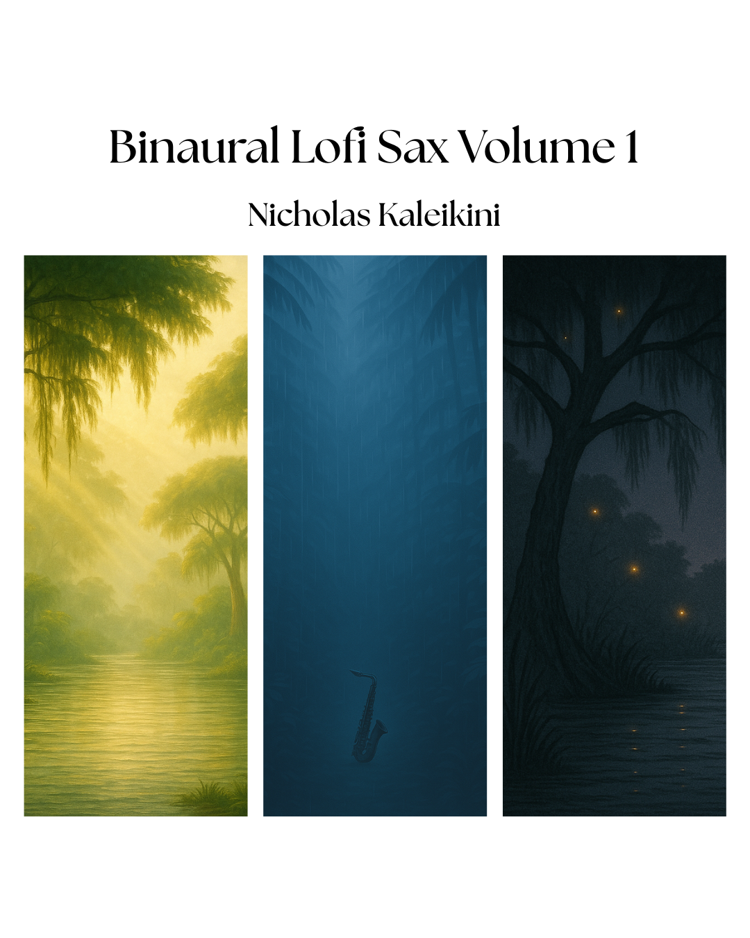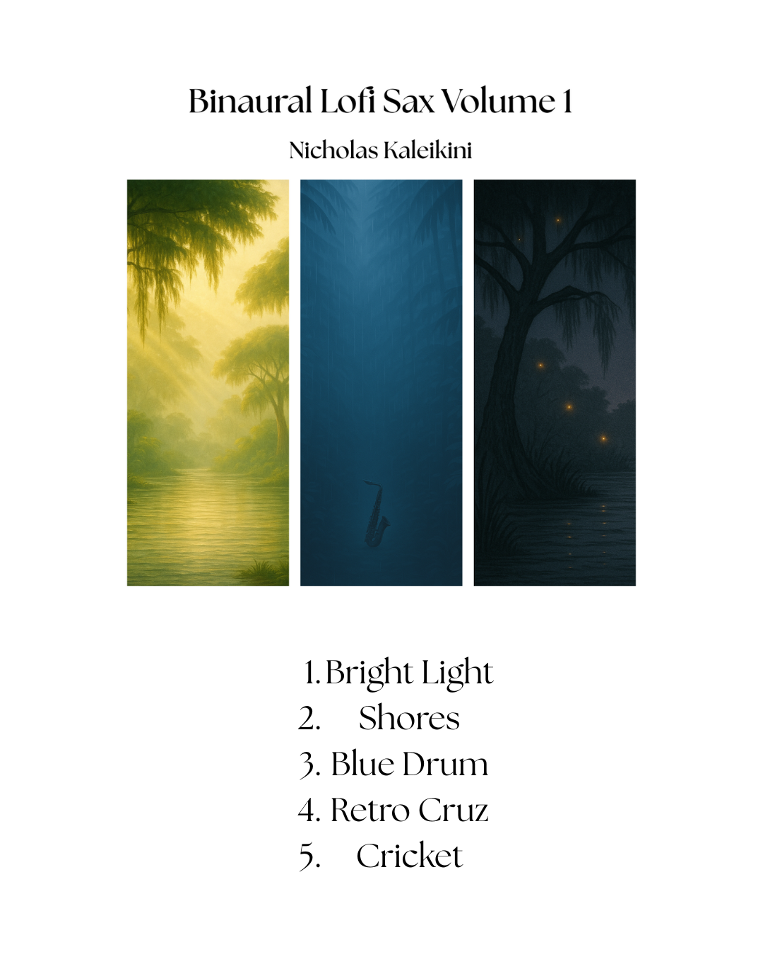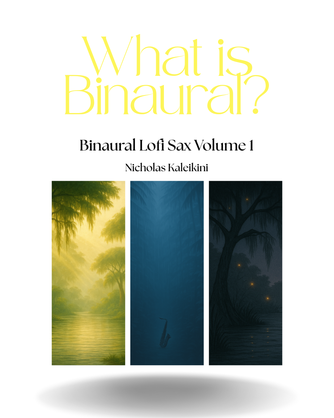 Nicholas’ newest release, Binaural Lofi Sax Volume 1, combines the effects of binaural beats with lofi beats and jazz influences. Binaural beats takes an oscillator sine wave and pans one frequency to the left (100Hz) and one frequency to the right (105Hz) creating a third frequency